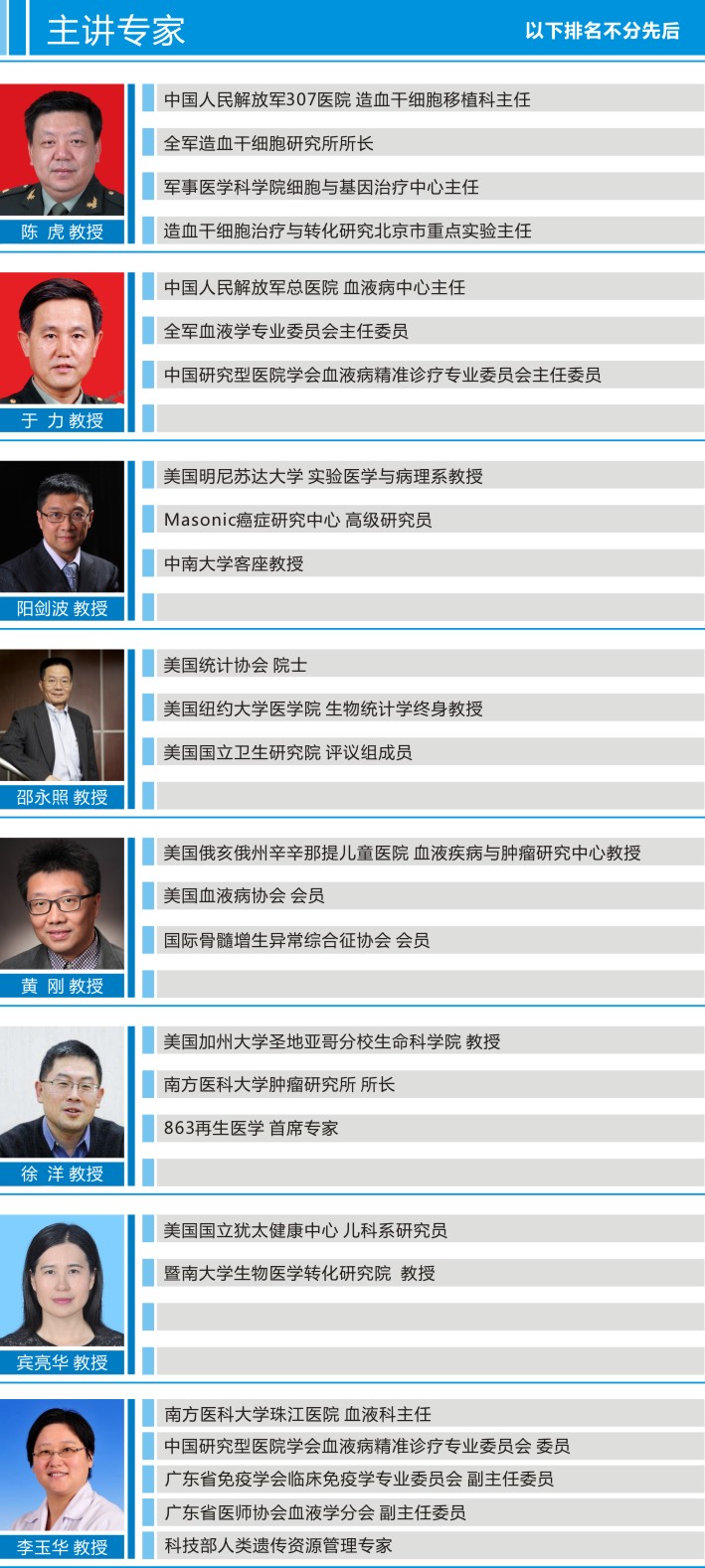 ![]() 2015年奥巴马提出的精准医学推动了整个了个体化医学的发展,所谓的精准医疗本质上是个体化医学体系。在这个体系中,基因测序是一个重要的前提条件,而干细胞则是精准医疗的绝佳载体。干细胞凭借其特性,通过自体细胞增殖或组织器官再生达到治疗目的,简而言之就是一种精准的个体化自体治愈过程。而另一层面,由于不同部位和用途的干细胞产品,能够精准到达受损部位或组织器官,可以成为靶向治疗药物的载体,精确到达病变部位。 随着干细胞技术和生物材料科技的发展,再生医学成为国际生物学和医学界备受关注的研究领域,成为继药物治疗、手术治疗之后的第三种疾病治疗途径。目前,干细胞与再生医学正处于重大科学技术革命性突破的前夜。 主办单位:南方医科大学珠江医院 协办单位:梵美国际转化医学研究院 时间:2017 年 5 月 13 日 8:30 ~ 18:00(周六) 地址:广州·琶洲 威斯汀酒店 论坛亮点 1. 探讨再生医学领域最新技术和科研产业变革 2. 分享精准医疗与转化医学前沿动态 3. 深度剖析干细胞、免疫细胞治疗现状研究及发展趋势 4. 促进生物与生命健康行业的国际交流与技术合作 一、受邀嘉宾:国内外顶级专家教授 陈虎 ※中国人民解放军307医院 造血干细胞移植科主任 ※全军造血干细胞研究所所长 ※军事医学科学院细胞与基因治疗中心主任 ※造血干细胞治疗与转化研究北京市重点实验室主任 于力 ※中国人民解放军总医院 血液病中心主任 ※全军血液学专业委员会主任委员 ※中国研究型医院学会血液病精准诊疗专业委员会主任委员 阳剑波 ※美国明尼苏达大学 实验医学与病理系教授 ※Masonic癌症研究中心 高级研究员 ※中南大学客座教授 ※梵美国际转化医学研究院 首席科学家 邵永照 ※美国统计协会 院士 ※美国纽约大学医学院 医学院生物统计学终身教授 ※美国国立卫生研究院 评议组成员 黄刚 ※美国俄亥俄州辛辛那提儿童医院 血液疾病与肿瘤研究中心教授 ※美国血液病协会 会员 ※国际骨髓增生异常综合征协会 会员 宾亮华 ※美国国立犹太健康中心 儿科系研究员 ※暨南大学生物医学转化研究院 教授 徐洋 ※美国加州大学圣地亚哥分校生命科学院 教授 ※南方医科大学肿瘤研究所 所长 ※863再生医学 首席专家 李玉华 ※南方医科大学珠江医院 血液科主任 ※中国研究型医院学会血液病精准诊疗专业委员会 委员 ※广东省医师协会血液学分会 副主任委员 ※广东省免疫学会临床免疫学专业委员会 副主任委员 ※科技部人类遗传资源管理专家 ![]() ![]() ![]()